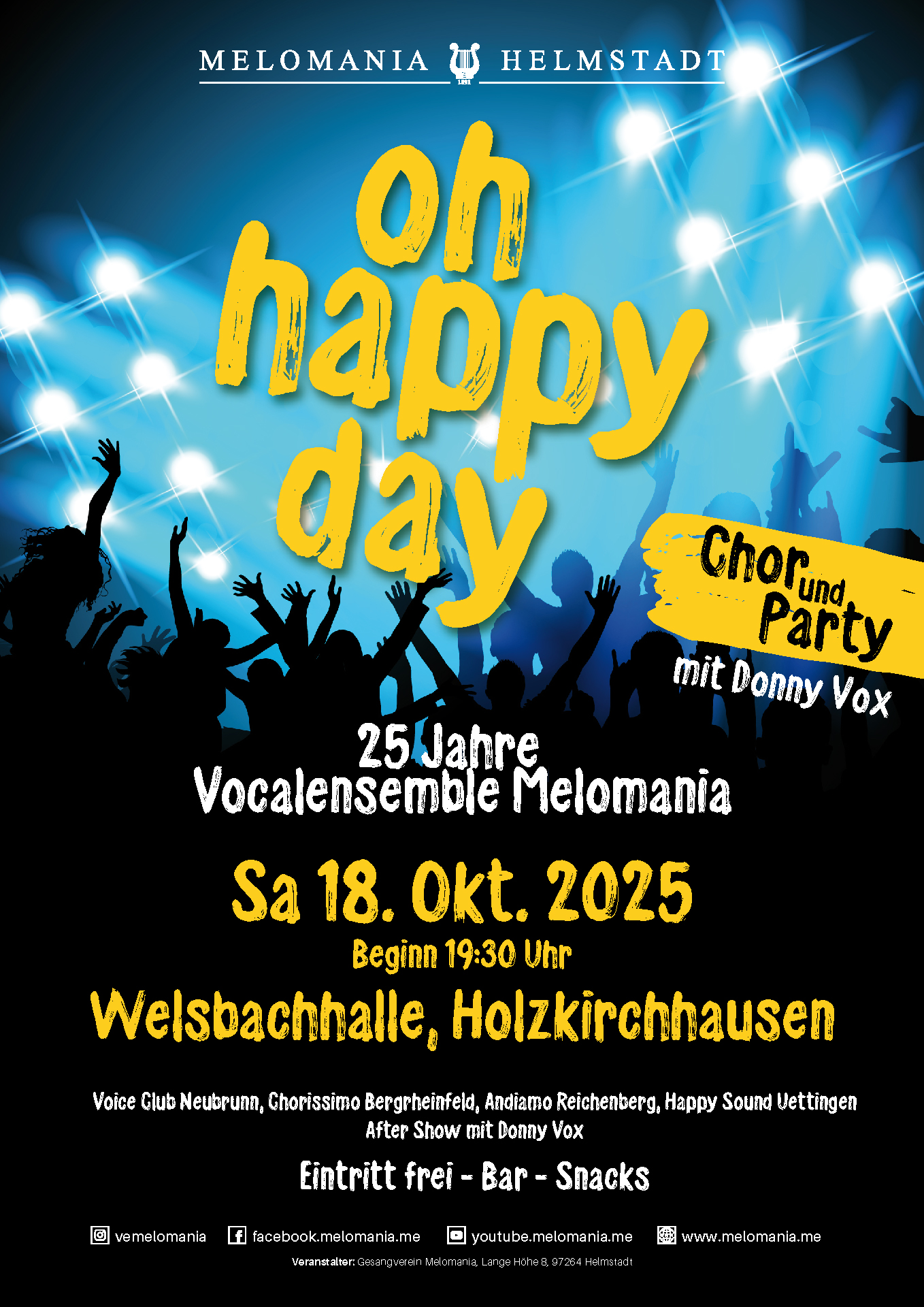 Kommt vorbei, feiert mit uns 25 Jahre Vocalensemble Melomania und erlebt Konzert und Party an einem Abend.