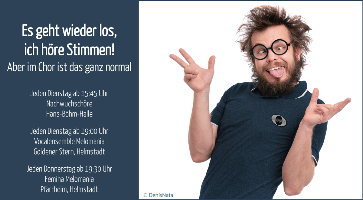 Immer Dienstags ab 15:30 Uhr unser Nachwuchs in der Hans-Böhm-Halle, ab 19:00 Uhr das Vocalensemble Melomania im Gasthaus Stern. Donnerstags folgen dann ab 19:30 Uhr die Femina Melomania im Pfarrheim.