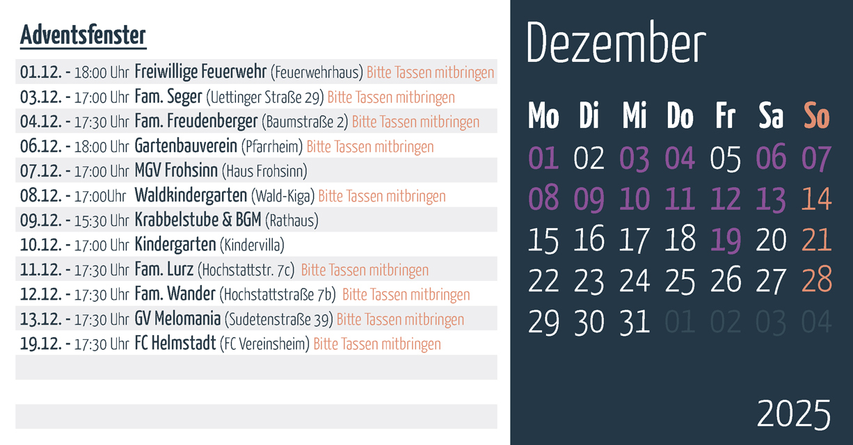 Bitte Tassen mitringenFreitag 12.12.2025 17:30 Uhr Hochstattstraße 7b, Helmstadt Fam. Wander Bitte Tassen mitringen Samstag 13.12.2025 17:30 Uhr Sudetenstr. 39, Helmstadt GV Melomania Zugang an der Kreuzung in den Hof